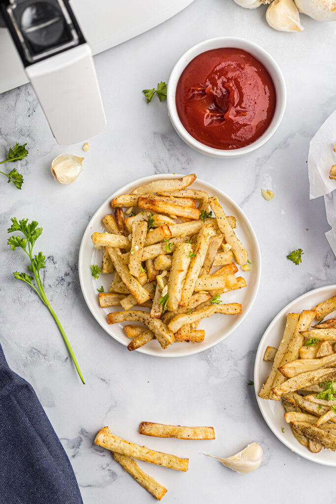 frytki czosnkowe, zdrowe frytki, przekąski z frytkownicy powietrznej, smaczne frytki, łatwe przepisy